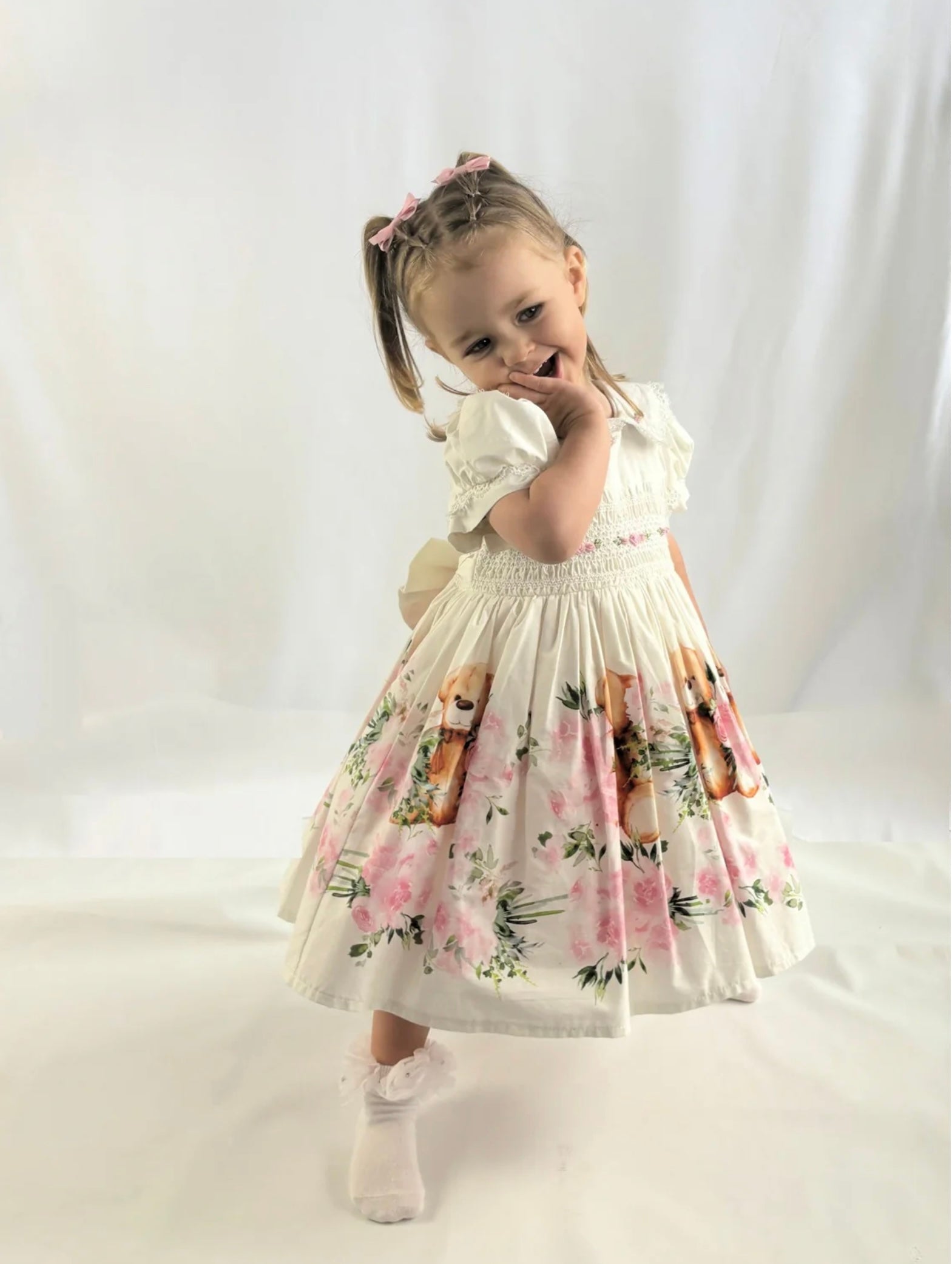 Very full multi layer skirt with floral/teddy border, short gathered sleeves.
