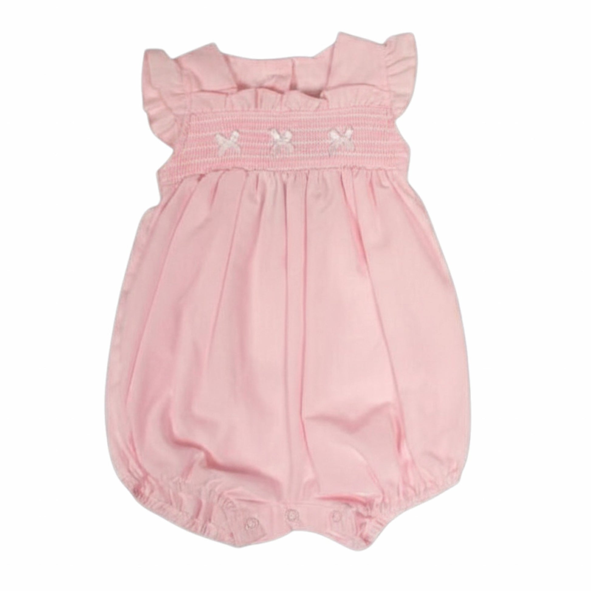 Pink romper with smocked panel with little white bows.