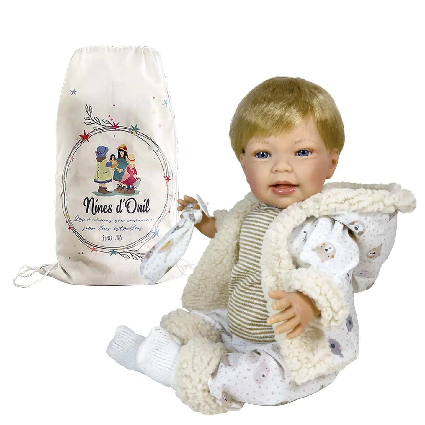 48cm doll and is articulated so can adopt different positions,has vinyl limbs and a soft body made with hypoallergenic fabric. Special features: has a very cheerful face thanks to smile, beautiful outfit, comes in bag. Made in Spain